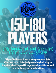 We have selected spots available on our 15-18U teams. Reach out to info@vipervolleyball.org for details!